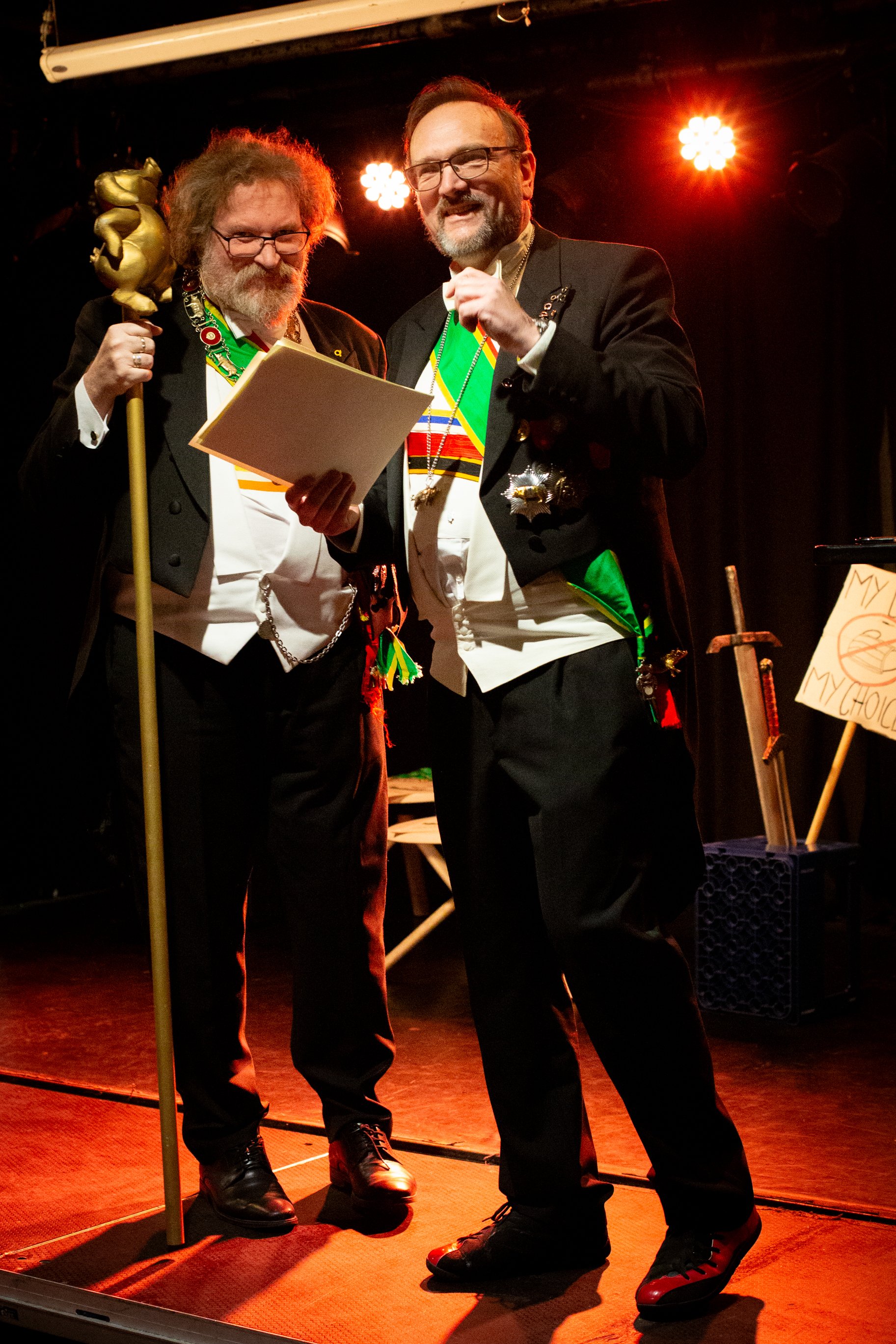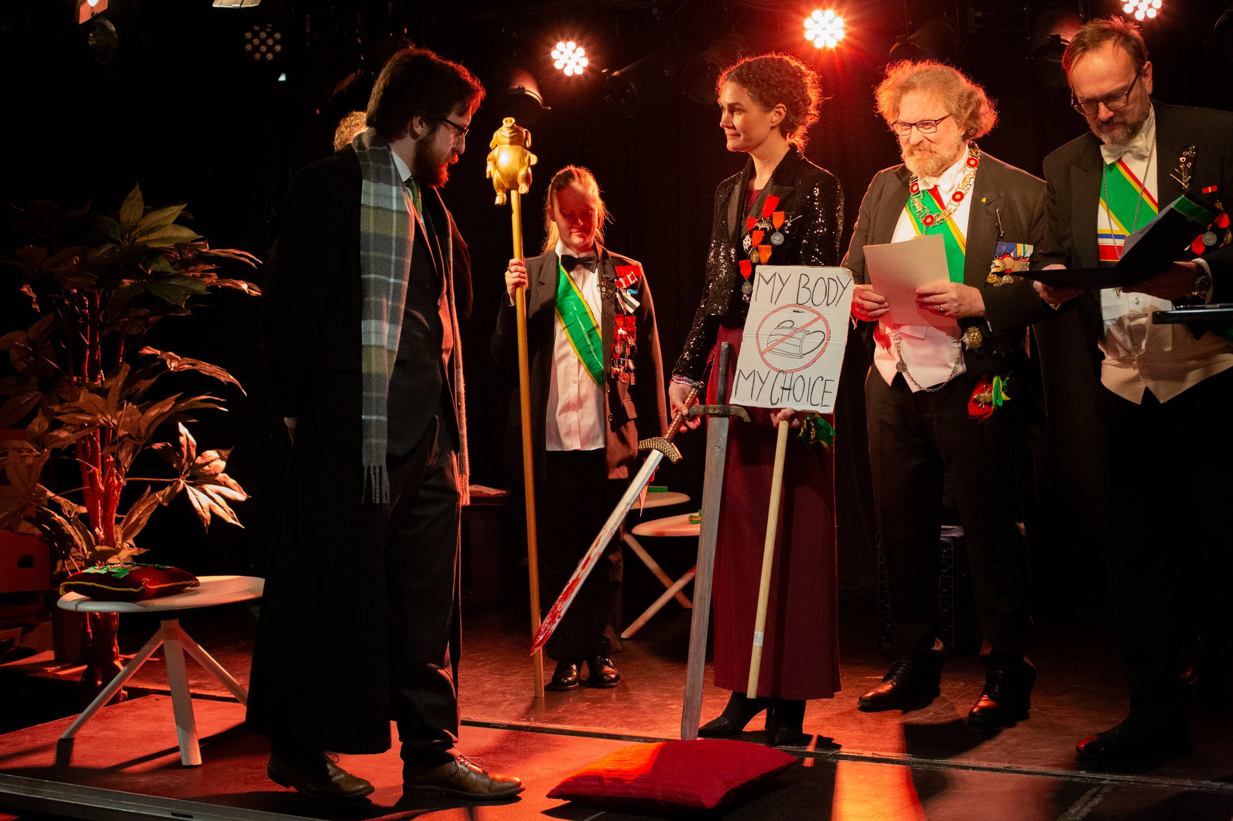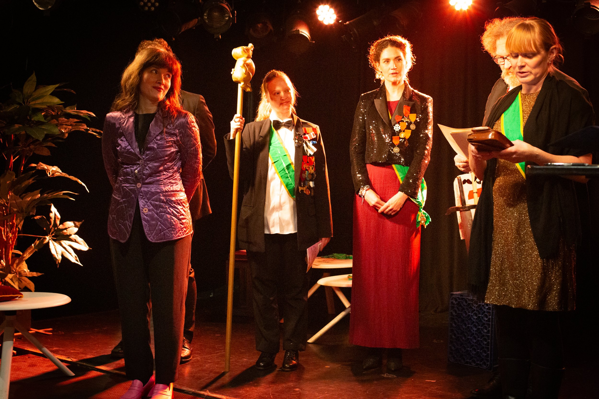 Hør! Hør! Hans Majestet Grisens teatralske venner! Det høytidelige Ordenskapitel har besluttet at late sin gunst regne over verdige og tro tjenere av Teater Neuf.