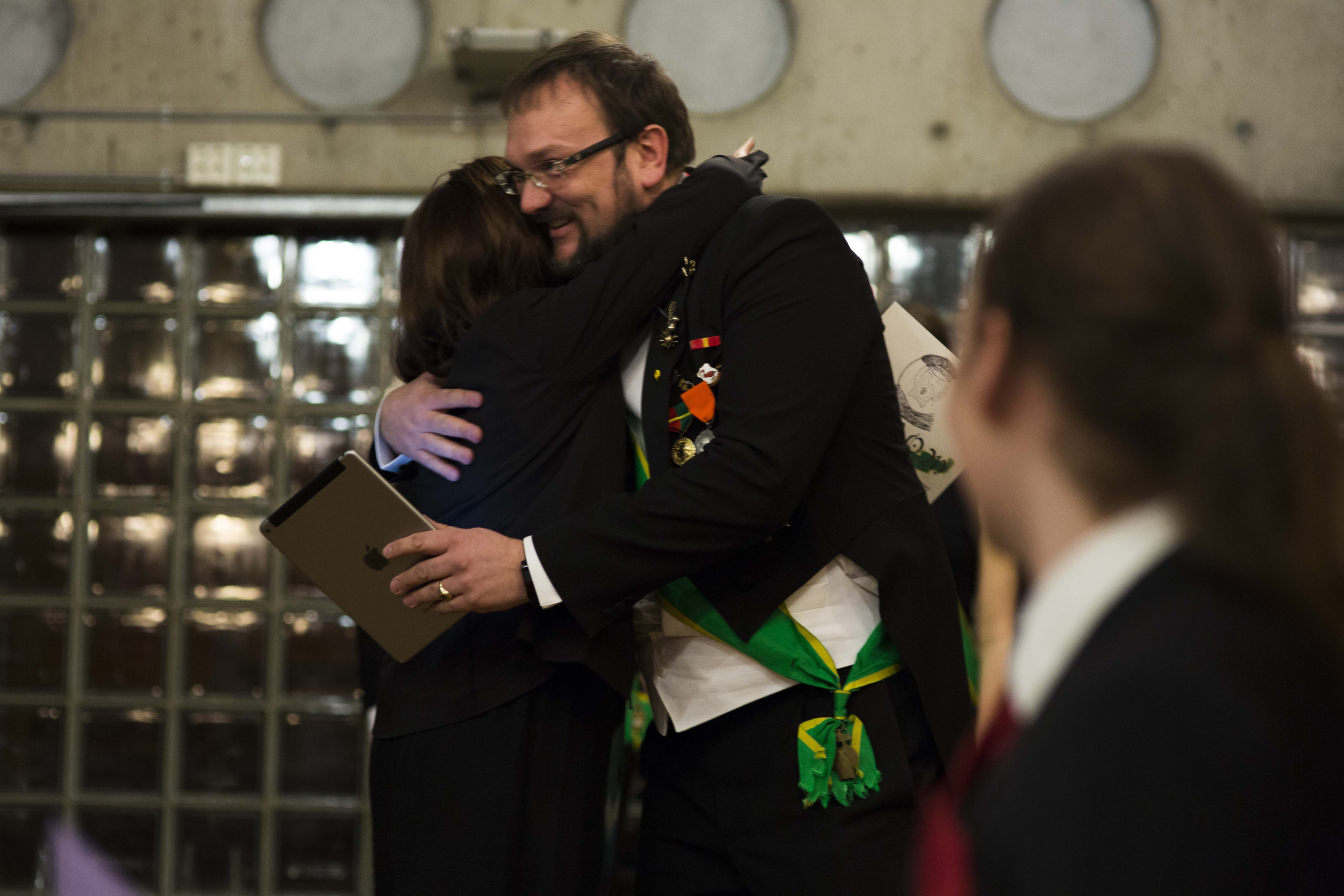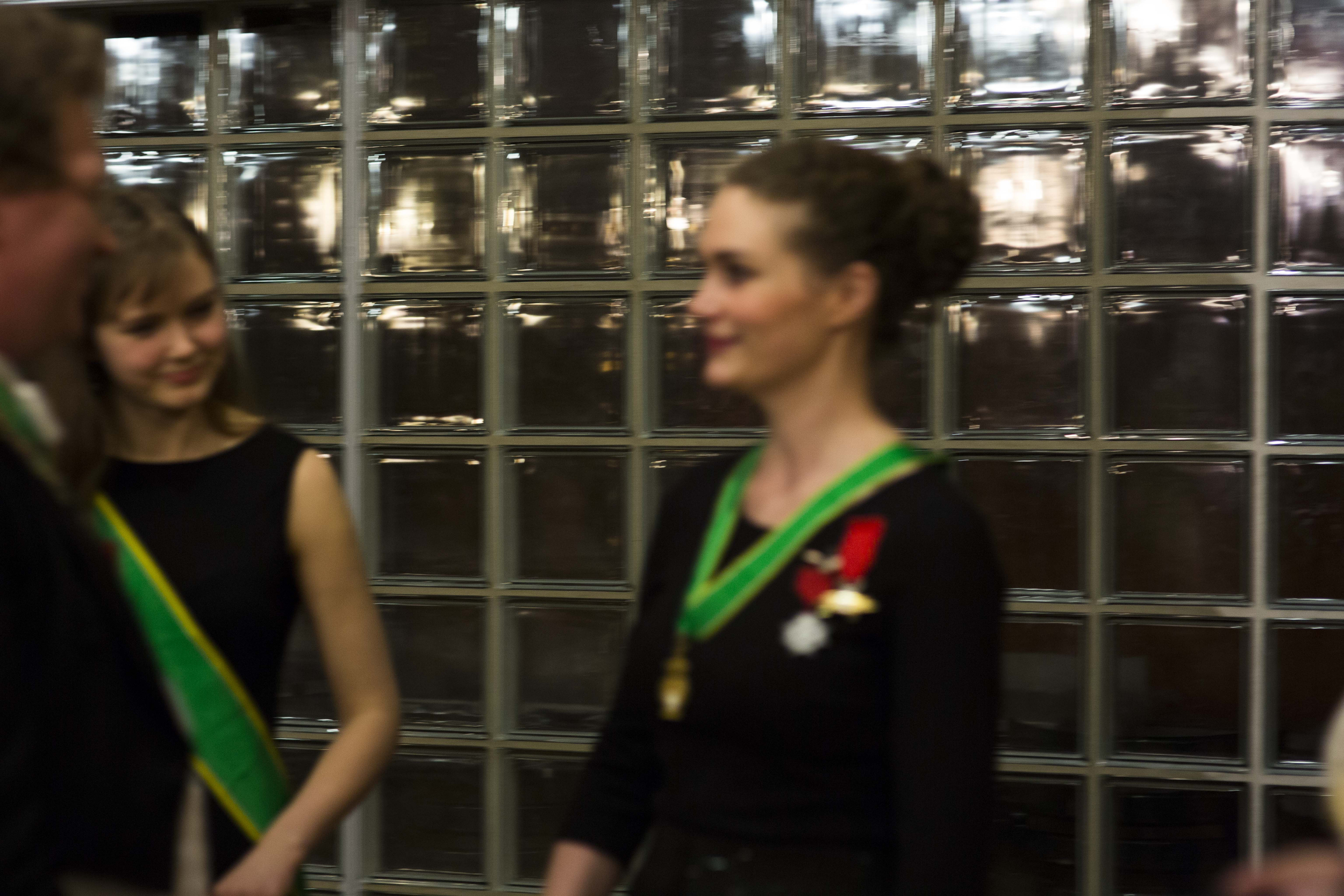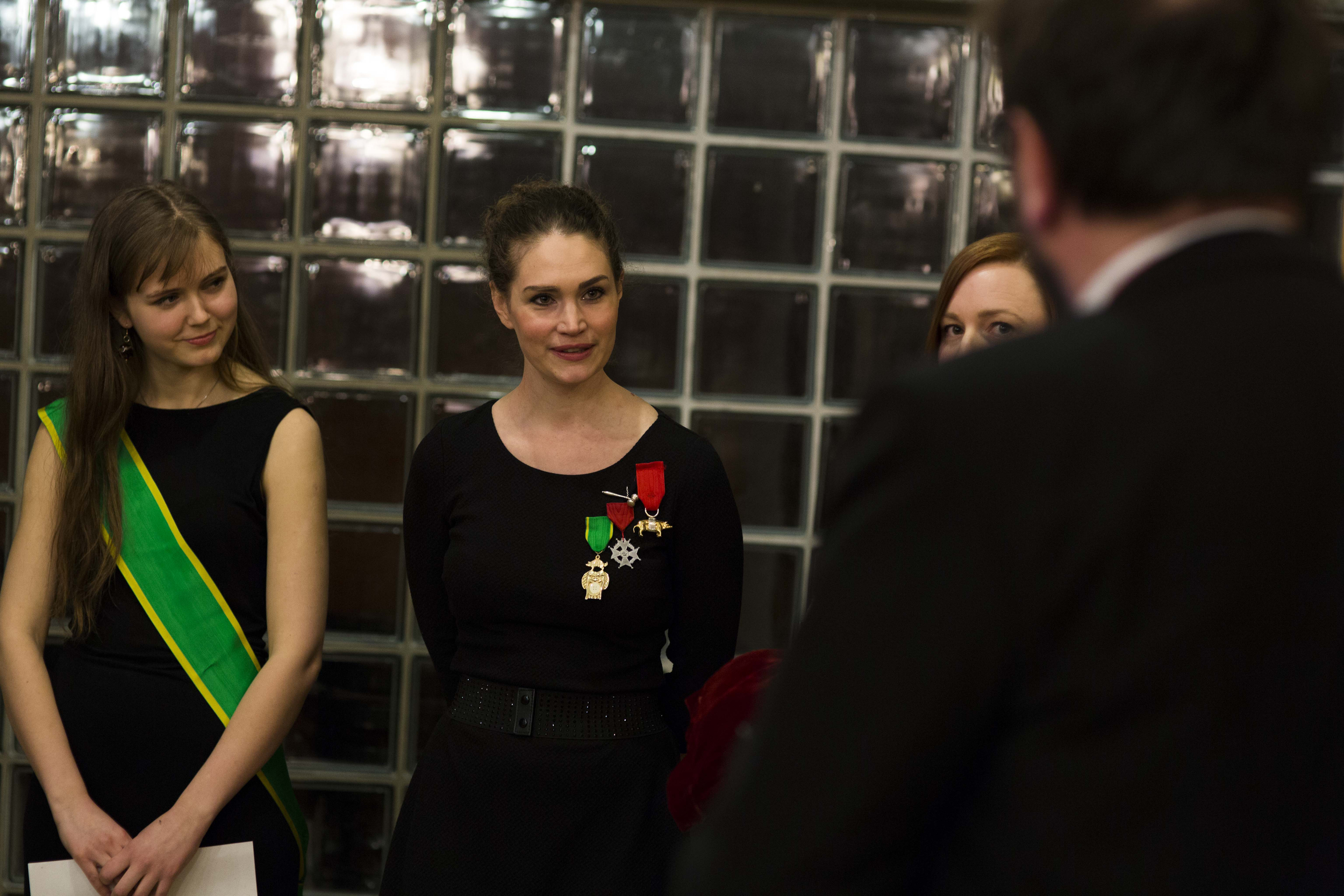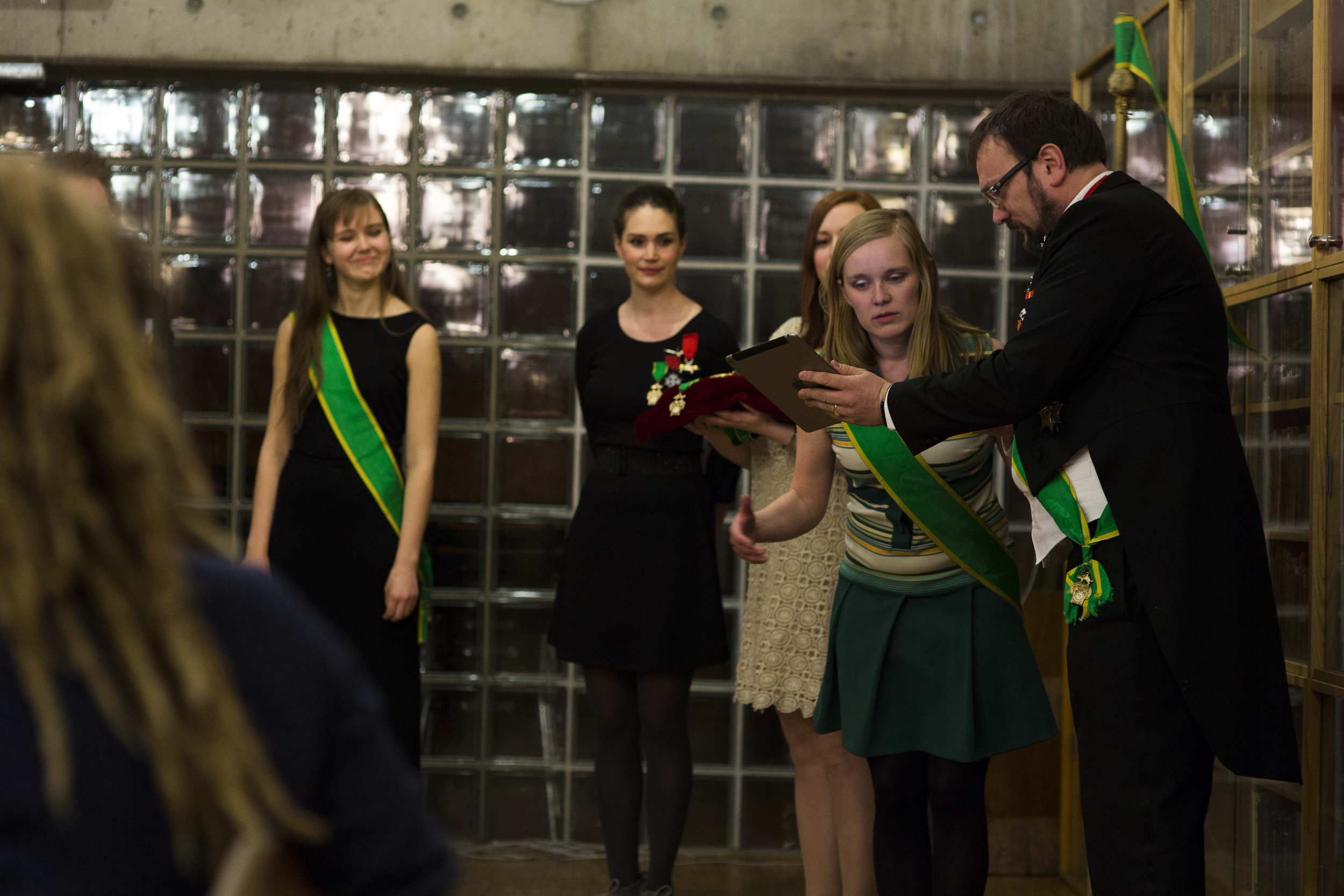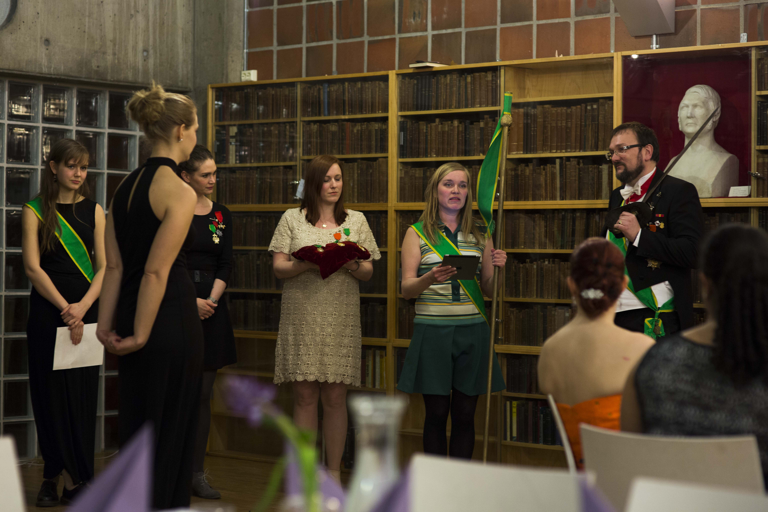 Formand i Det Norske Studentersamfund og tidligere teatersjef Kristin Wolmer knelte og ble utnevnt til Ridder.