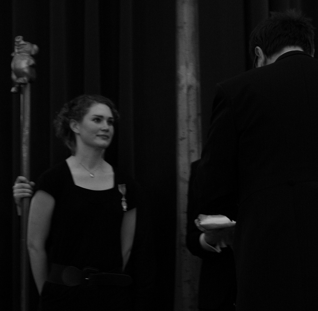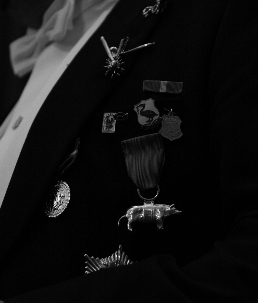 I erindringen om, at De i slutningen af 50-aarene stod i spidsen for studenterscenen, og ogsaa paa dette felt at studenterlivet har arbeidet med, vover vi efter kapitlets enstemmige beslutning at bede Dem modtage vor ordens høieste utmærkelse.”